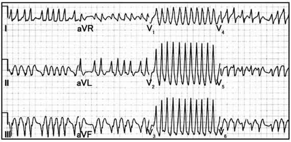 Sự xuất hiện của rung nhĩ trong sự hiện diện của một đường dẫn phụ. Nét đặc biệt lộ rõ khoảng thời gian phức bộ biến đổi với khoảng cách không đều.